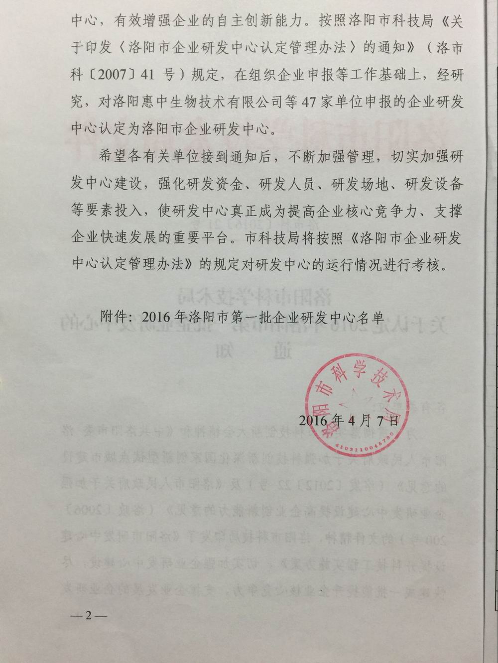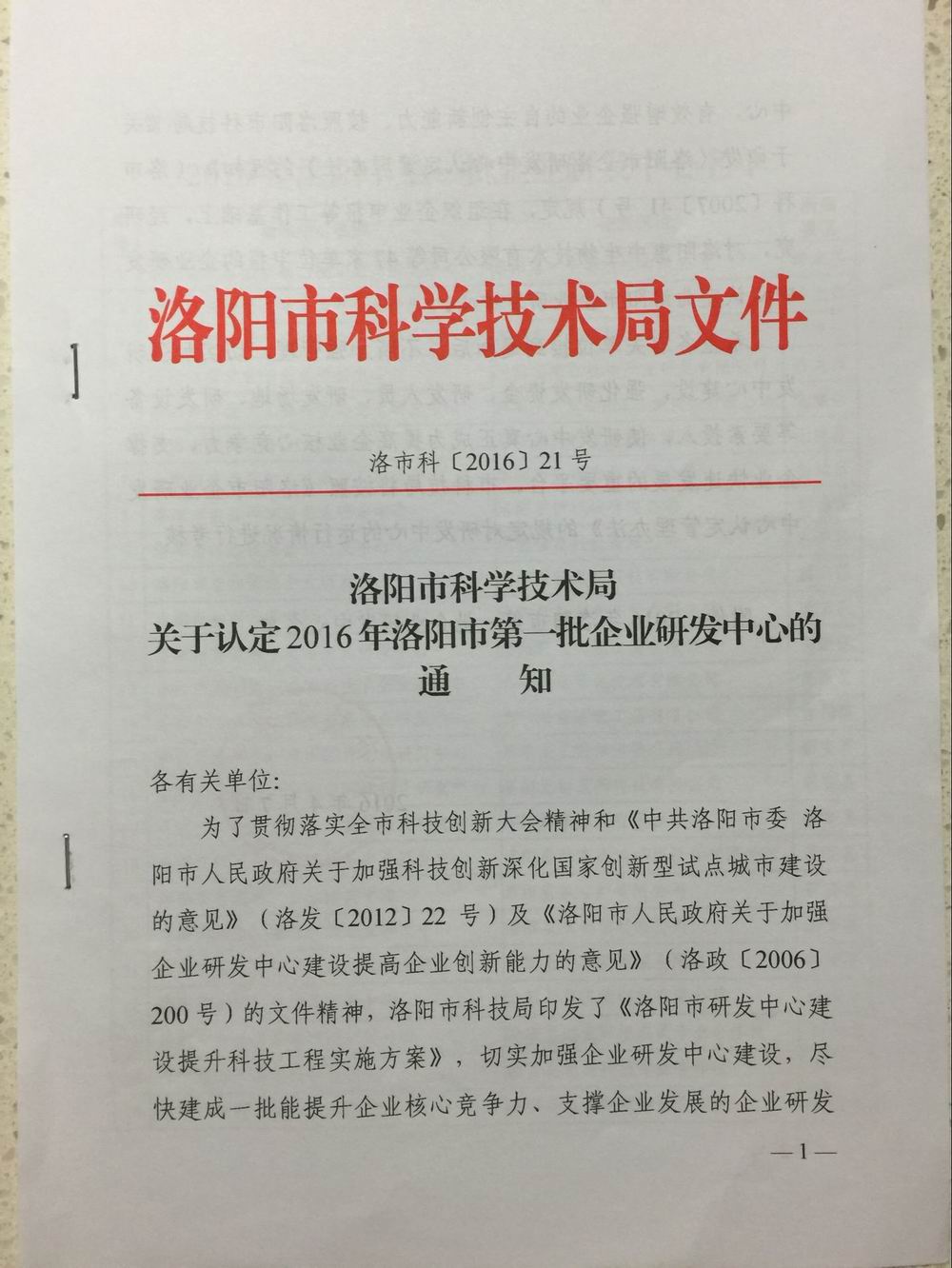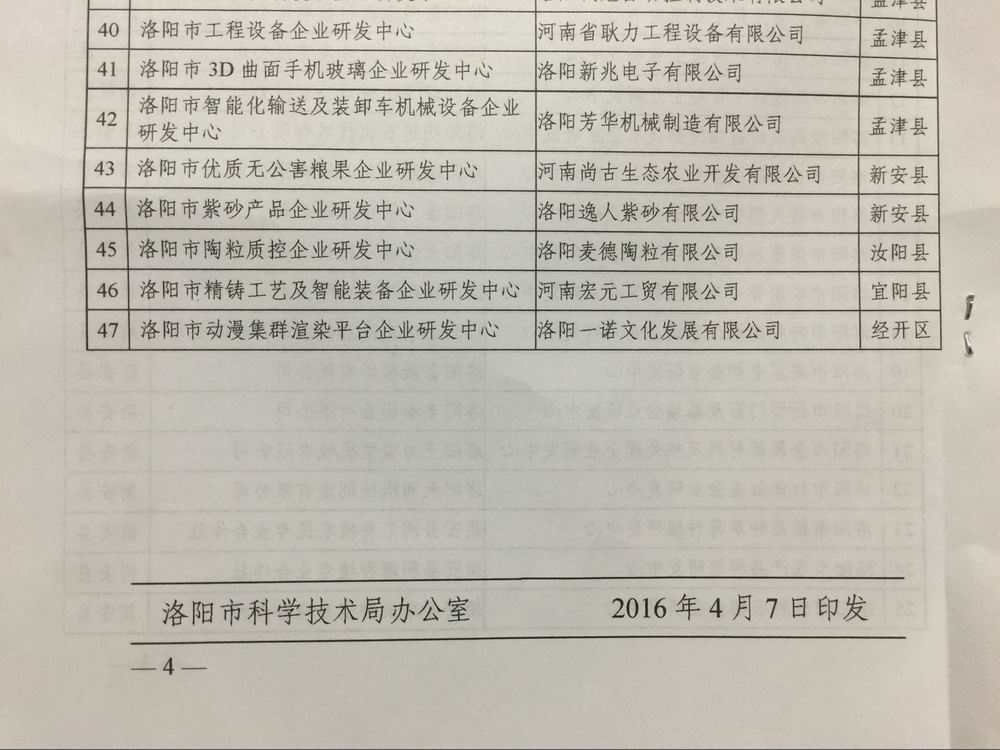 洛阳市科学技术局今日下发了《关于认定2016年洛阳市第 一批企业研发中心的通知》,随着通知的下达,我司企业研发中心正式成立!